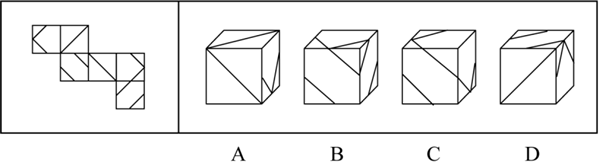 【例題】左邊給定的是紙盒的外表面,下列哪一項(xiàng)能由它折疊而成( )。