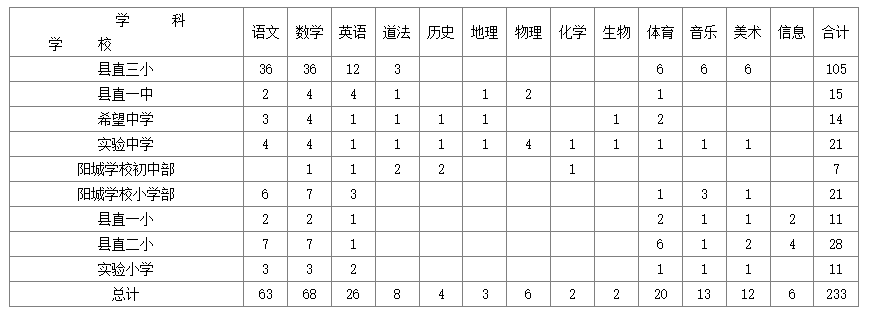 2024年公開選調(diào)縣內(nèi)教師共計233名。具體選調(diào)崗位名額分配如下: