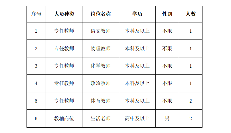 因?qū)W校實際用人需求,現(xiàn)招聘專任教師6名、教輔2名(男)。其中,語文教師1名、物理教師1名、化學(xué)教師1名、政治教師1名、體育教師2名;生活老師2名(男)。