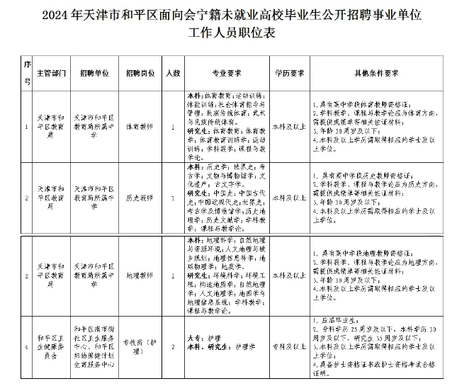 ?。ㄋ模┢渌麠l件詳見《2024年天津市和平區(qū)面向會寧籍未就業(yè)高校畢業(yè)生公開招聘事業(yè)單位工作人員職位表》。