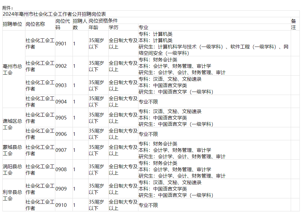 2024年亳州市社會化工會工作者公開招聘崗位表