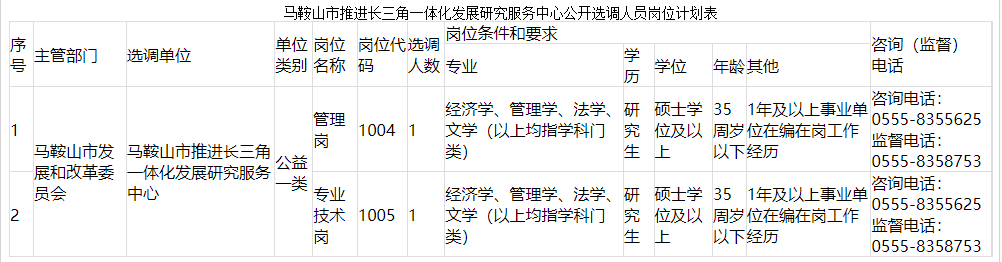 本次計劃面向全省公開選調(diào)事業(yè)單位工作人員2名。具體崗位及選調(diào)資格條件見《馬鞍山市推進長三角一體化發(fā)展研究服務(wù)中心公開選調(diào)人員崗位計劃表》(見附件)。