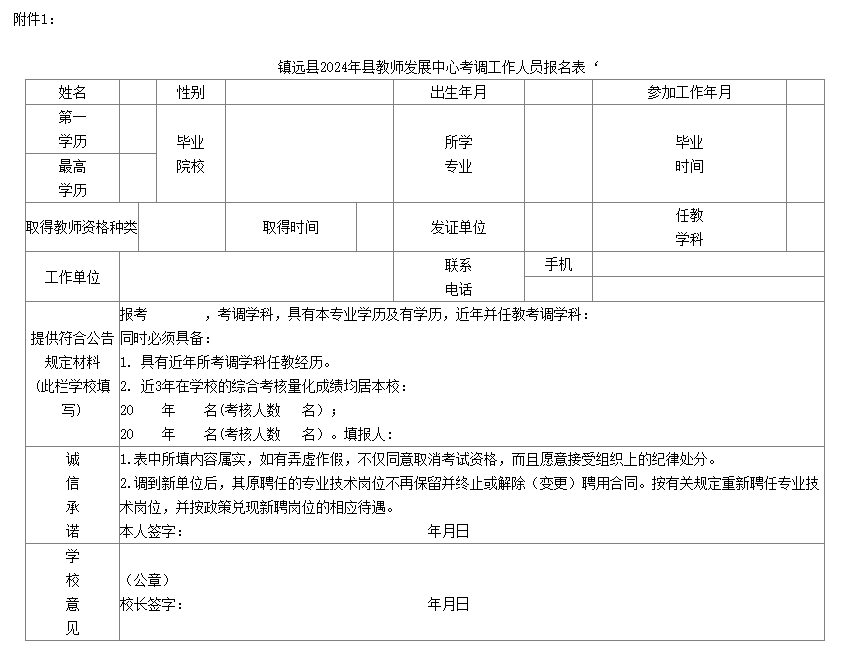 附件:1.鎮(zhèn)遠(yuǎn)縣2024年縣教師發(fā)展中心考調(diào)工作人員報(bào)名表