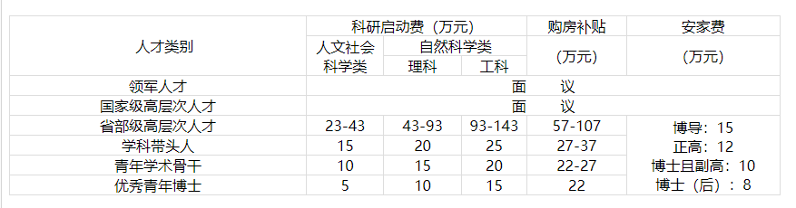 ?。?)學(xué)校為全職在我校工作的引進(jìn)人才提供博士學(xué)位津貼、安家費(fèi)、購(gòu)房補(bǔ)貼和科研啟動(dòng)費(fèi)等,安家費(fèi)、購(gòu)房補(bǔ)貼(分5年支付)和科研啟動(dòng)費(fèi)標(biāo)準(zhǔn)見(jiàn)《全職引進(jìn)人才享受優(yōu)惠待遇參照表》,博士學(xué)位津貼按每月1000元發(fā)放。