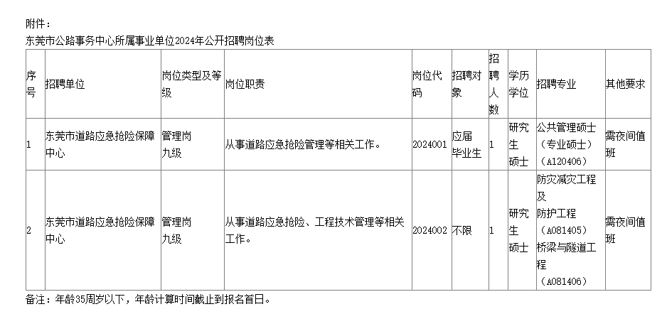 具體的招聘單位、崗位、人數和資格條件見《東莞市公路事務中心所屬事業(yè)單位2024年公開招聘崗位表》(附件)。