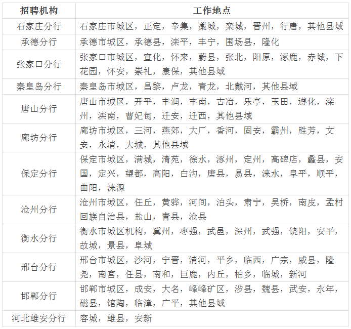 3.大學(xué)生村官及“三支一扶”人員專項報名通道主要面向以下機構(gòu)開放:所轄各地市(河北雄安分行、承德分行除外)的縣域機構(gòu)。