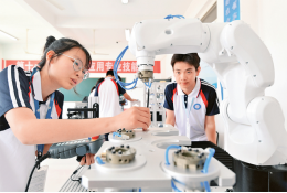 加快實(shí)現(xiàn)高水平科技自立自強(qiáng)、建設(shè)科技強(qiáng)國和人才強(qiáng)國,需要培養(yǎng)好使用好大批青年科技人才。圖為2024年5月29日,在河北省石家莊市平山縣職業(yè)教育中心工業(yè)機(jī)器人實(shí)訓(xùn)室,學(xué)生進(jìn)行工業(yè)機(jī)器人操作實(shí)訓(xùn)。人民圖片 張曉峰/攝