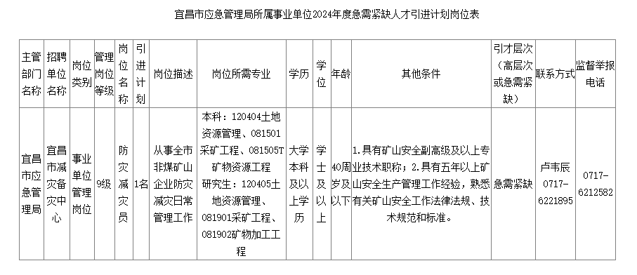 附件:宜昌市應(yīng)急管理局所屬事業(yè)單位2024年度急需緊缺人才引進(jìn)計(jì)劃崗位表