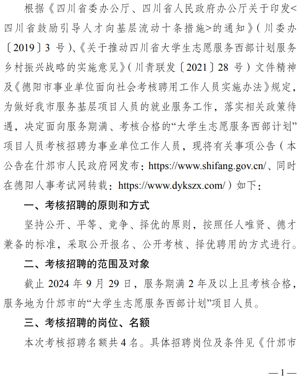四川德陽什邡市鄉(xiāng)鎮(zhèn)事業(yè)單位從“大學生志愿服務西部計劃”項目人員中招聘4人公告