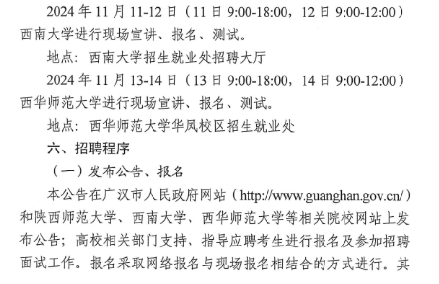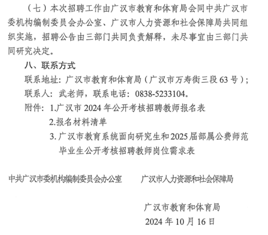 中共廣漢市委機(jī)構(gòu)編制委員會(huì)辦公室 廣漢市人力資源和社會(huì)保障局 廣漢市教育和體育局 關(guān)于面向高校研究生、2025屆部屬公費(fèi)師范畢業(yè)生公開(kāi)考核招聘教師的公告