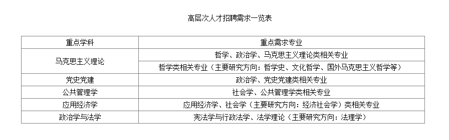 主要招聘哲學(xué)、理論經(jīng)濟(jì)學(xué)、應(yīng)用經(jīng)濟(jì)學(xué)、法學(xué)、政治學(xué)、社會(huì)學(xué)、馬克思主義理論、中共黨史黨建學(xué)、公共管理學(xué)等人文與社會(huì)科學(xué)類學(xué)科領(lǐng)軍人才、學(xué)科帶頭人等高層次人才若干名、應(yīng)屆博士畢業(yè)生14名。