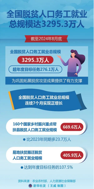 今年以來(lái)各級(jí)各相關(guān)部門(mén)深入開(kāi)展防止返貧就業(yè)攻堅(jiān)行動(dòng),截至8月底,全國(guó)脫貧人口務(wù)工就業(yè)總規(guī)模達(dá)到3295.3萬(wàn)人,超年度目標(biāo)任務(wù)276.1萬(wàn)人,為鞏固拓展脫貧攻堅(jiān)成果提供了有力支撐。新華社發(fā) 王威/制圖