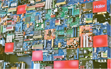 我國實施全面節(jié)約戰(zhàn)略,大力發(fā)展循環(huán)經濟。圖為2024年9月27日,在海爾綠色再循環(huán)互聯(lián)工廠展廳內拍攝的用廢舊電路板制作的裝飾墻。海爾綠色再循環(huán)互聯(lián)工廠每年可拆解廢舊家電200萬臺,再生循環(huán)新材料約3萬噸。新華社記者李紫恒/攝