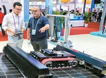 黨的十八大以來,我國以年均3.3%的能源消費增速支撐了年均6.1%的經濟增長,能耗強度累計下降26.1%,是全球能耗強度降低最快的國家之一。圖為2024年10月15日,采購商在第136屆廣交會展館了解一款太陽能面板自動清潔機器人產品。新華社記者劉大偉/攝