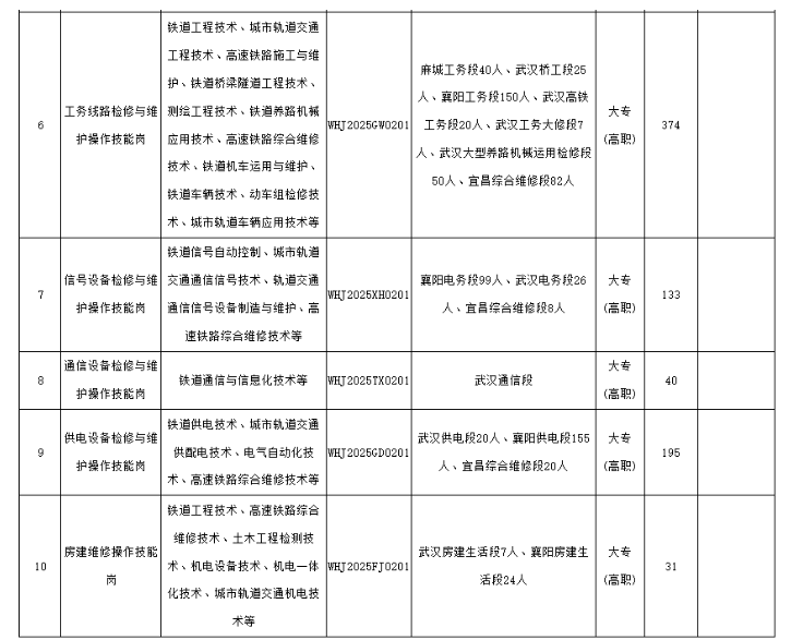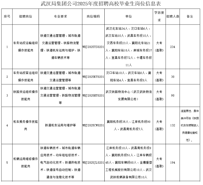 附:武漢局集團(tuán)公司2025年度招聘高校畢業(yè)生崗位信息表
