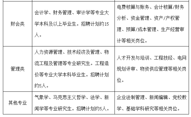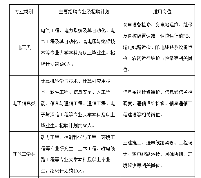 招聘專業(yè)類別為電工類、電子信息類、其他工學(xué)類、財(cái)會(huì)類、管理類及其他專業(yè),招聘專業(yè)是指主修專業(yè),不包含輔修專業(yè)。最終招聘數(shù)量將根據(jù)上級(jí)單位核定情況相應(yīng)調(diào)整,第一批招聘數(shù)量(含提前批校園招聘數(shù)量)暫定如下: