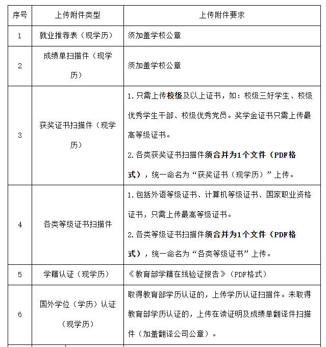3.上傳應(yīng)聘附件材料。應(yīng)聘畢業(yè)生須通過(guò)招聘平臺(tái)及時(shí)、規(guī)范上傳個(gè)人應(yīng)聘附件材料,應(yīng)聘附件材料文檔數(shù)量不超過(guò)7個(gè)。應(yīng)聘畢業(yè)生應(yīng)確保應(yīng)聘材料能正常打開(kāi)、清晰顯示,因應(yīng)聘材料不能正常打開(kāi)、圖像不清晰或未按規(guī)范要求填報(bào)導(dǎo)致的結(jié)果由應(yīng)聘畢業(yè)生本人承擔(dān)。上傳附件具體要求如下: