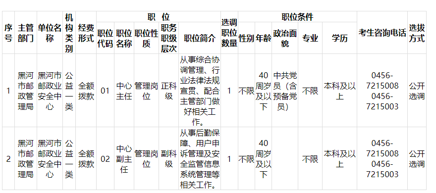本次計(jì)劃公開選調(diào)事業(yè)單位工作人員2名,具體選調(diào)崗位、條件等情況詳見《黑河市郵政業(yè)安全中心2024年公開選調(diào)事業(yè)單位工作人員崗位計(jì)劃表》(附件1)。