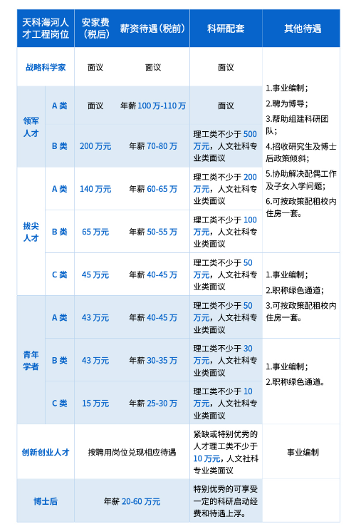 1.聘為學(xué)?!疤炜迫瞬拧倍塀崗(事業(yè)編制正高教職,特聘教授),提供崗位年薪70-80萬元(稅前),另可疊加科研績效;
