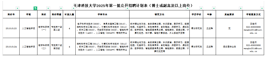 崗位具體要求詳見《天津科技大學(xué)2025年第一批公開招聘方案(博士或副高及以上崗位)》