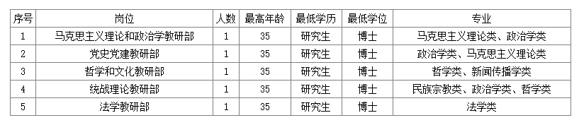 4.熱愛干部教育事業(yè),所學專業(yè)或研究方向符合校(院)學科建設需要,具有扎實的馬克思主義理論和專業(yè)理論功底;有一定的教學科研能力,能夠勝任校(院)教學和科研工作,服從校(院)工作安排。