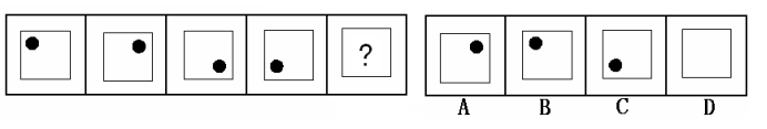 (答案:B。黑點(diǎn)在正方形中順時(shí)針移動(dòng)。在第5個(gè)圖形中,應(yīng)該正好移動(dòng)到左上角。)
