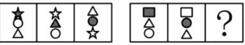 如上圖,元素組成相似,優(yōu)先考慮樣式規(guī)律。前兩幅圖去異存同得到第三個(gè)圖形。
