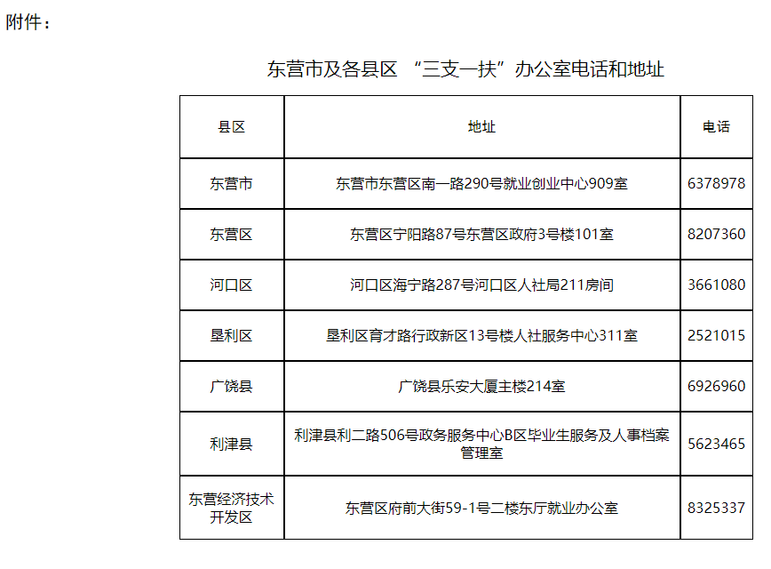 附件:東營市及各縣區(qū)、開發(fā)區(qū)“三支一扶”辦公室電話和地址