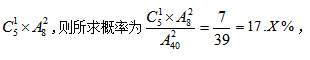【解析】先將小張的座位固定,剩39個(gè)座位小李可以選,小李要和小張坐在同一排,只能在小張坐的那一排剩余的7個(gè)位置上選,故兩人坐在同一排的概率是