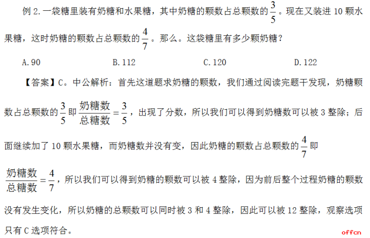 利用整除法去解題,不需要分析題干中的所有條件,不需要層層遞進(jìn)的分析題干中各種數(shù)量之間的關(guān)系,重點在于抓住題干中的一句話,或者一個簡單的符號來分析問題,排除錯誤選項,這也是整除法的核心。