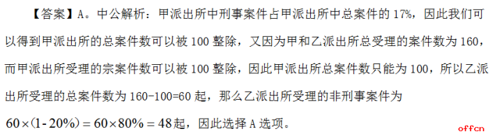 例3.兩個派出所某月共受理案件160起,其中甲派出所受理的案件中有17%是刑事案件,乙派出所受理的案件中有20%是刑事案件,問乙派出所在這個月中共受理多少起非刑事案件?