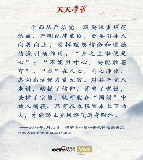 2016年1月12日,習(xí)近平總書記在十八屆中央紀(jì)委六次全會(huì)上發(fā)表重要講話。在講話中,習(xí)近平總書記站在新時(shí)代黨和國家事業(yè)發(fā)展全局的高度,引用中國古代廉政名言,深刻闡釋全面從嚴(yán)治黨等重大理論和實(shí)踐問題,既直面問題、切中時(shí)弊,又充滿自信、催人奮進(jìn),為深入推進(jìn)黨風(fēng)廉政建設(shè)和反腐敗斗爭提供了思想武器和行動(dòng)指南。