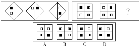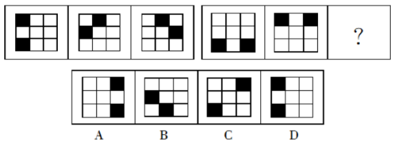 【解析】B。圖形相似度很高,位置不同,考慮位置關(guān)系,題干第一組圖形中的黑色方塊依次順時(shí)針移動(dòng)1格、2格得到下一個(gè)圖形;依此規(guī)律,第二組圖形中的黑色方塊依次順時(shí)針移動(dòng)4格、5格得到下一個(gè)圖形,整體為遞增規(guī)律,故選B。