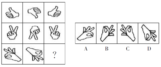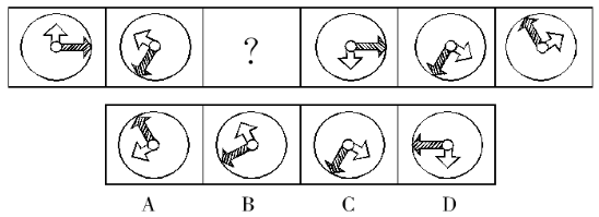 【解析】A。題干圖形的構(gòu)成相同,只是箭頭的位置不同,需要對(duì)比分析箭頭位置變化的規(guī)律。從第一個(gè)圖形開始,短箭頭每次逆時(shí)針旋轉(zhuǎn)60°,長(zhǎng)箭頭每次順時(shí)針旋轉(zhuǎn)120°,由此可確定問號(hào)處圖形箭頭的位置,答案為A。