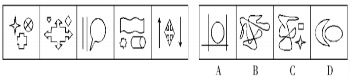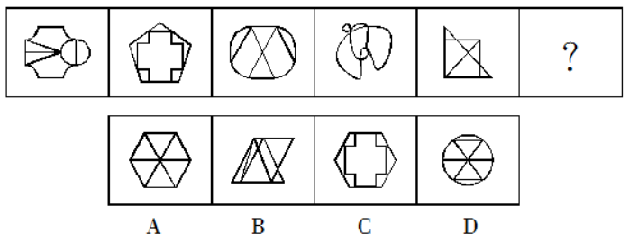 【解析】:觀察題干給出的圖形,題干圖形相似度低,組成較為凌亂,但是每個(gè)圖形都被分割成了若干個(gè)封閉區(qū)域,優(yōu)先數(shù)封閉區(qū)域的個(gè)數(shù),發(fā)現(xiàn)題干圖形的封閉區(qū)域數(shù)都是6,應(yīng)選A。
