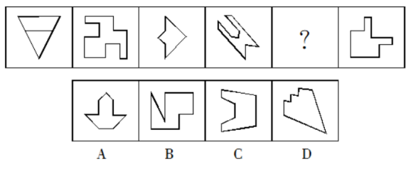 【解析】:觀察題干給出的圖形,發(fā)現(xiàn)圖形相似度不高而且圖形不規(guī)整,優(yōu)先考慮數(shù)量關(guān)系,發(fā)現(xiàn)題干每個(gè)圖形都是由三部分構(gòu)成,構(gòu)成圖形的部分?jǐn)?shù)相同,由此選擇C。