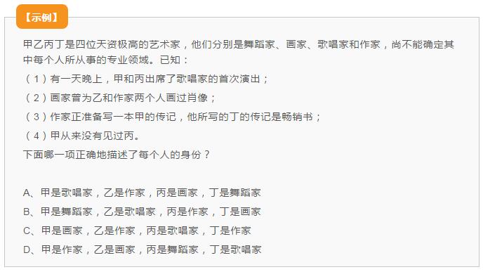【點撥】由條件(1)可知:甲和丙都不是歌唱家,排除選項A、C;由條件(2)可知:乙不是畫家,排除選項D。故答案為B。