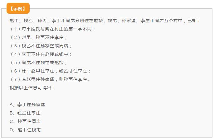 【解析】根據(jù)條件(2)甲不住李莊且丙不住李莊,結(jié)合條件(6)和(7)可知,乙不住在李莊,甲不住在孫家堡。此時,由因為每個人的姓氏與村莊第一個字不同,所以丁也不住李莊,只能戊住在李莊,排除B項;