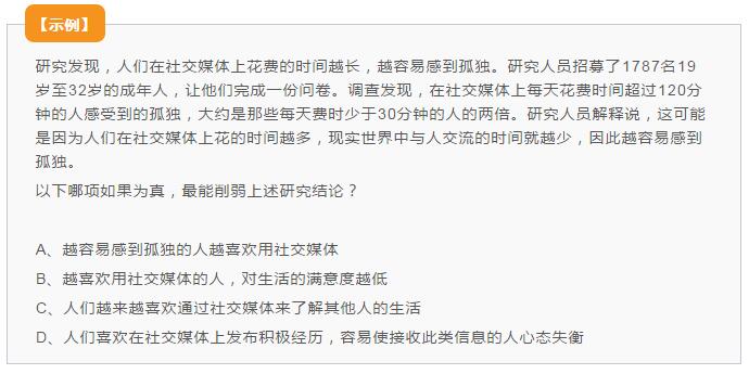 A項,指出越容易感到孤獨的人越喜歡用社交媒體,說明并不是因為在社交媒體上花費的時間越長才越容易感到孤獨,而是因為本身孤獨才會去使用社交媒體,屬于因果倒置的削弱項,削弱了題干結(jié)論,并且因果倒置的削弱力度很強,因此可以直接選擇A。