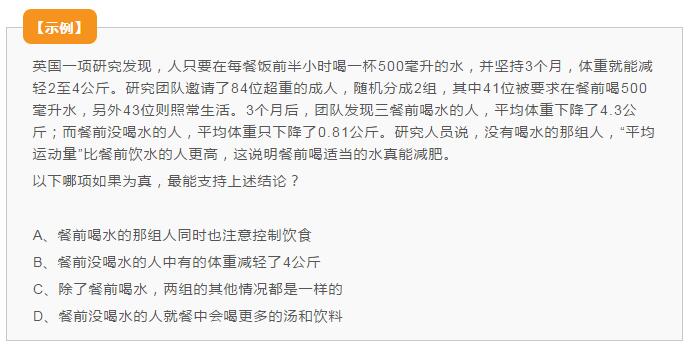 【點撥】題干內(nèi)容為通過兩組不同人員的對照試驗,去研究餐前喝水與減肥之間的關(guān)系,考查對比實驗。為確保實驗結(jié)果的有效性,通常只能設(shè)置一個變量,其他因素應(yīng)該保持一樣。C項說明兩組對象其他條件一致,即排除了其他因素的影響,確保了實驗的有效,支持了題干結(jié)論,當選。而A項則說明可是能控制飲食這個原因?qū)е虏颓昂人娜梭w重下降得更多,屬于另有他因,削弱了題干,為削弱項。