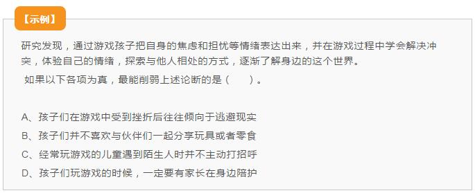 【點撥】題干結(jié)論是孩子通過游戲可以把自己的情緒表達出來,解決矛盾沖突,學(xué)會與他人相處,并了解身邊的世界。A項指出孩子在游戲中受挫后會逃避現(xiàn)實,說明通過游戲不能起到解決沖突,了解世界的作用,直接削弱了題干結(jié)論,當選。B和D都是不能削弱的,C的選項不打招呼并不一定就是由于游戲的原因,可能是孩子本身就很自閉內(nèi)向。