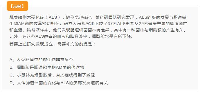 B項,既有“煙酰胺”,也有“AM菌”,且指出煙酰胺是腸道微生物AM菌的代謝物,說明煙酰胺的水平確實和AM菌有關(guān),建立了前提與結(jié)論之間的聯(lián)系,為搭橋項,為題干論證成立的前提,當選。