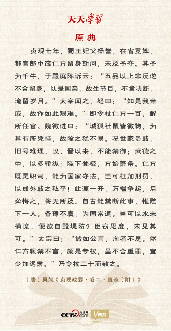 魏徵覺(jué)得唐太宗的做法非常不妥,便進(jìn)諫道:“薛仁方作為國(guó)家官吏,奉公守法,怎么能夠枉加處罰,讓外戚的私欲得逞呢?此例一開(kāi),事端爭(zhēng)起,將來(lái)必然追悔莫及?!眲裰G太宗“備豫不虞,為國(guó)常道”,太宗聽(tīng)后有所觸動(dòng)。