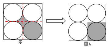 一部分是內部小圓的面積,一部分是四個圓中間形成的陰影部分面積,單獨求解四個圓中間形成的陰影部分面積不好求解,可連接正方形四邊的中點,因四個圓兩兩相切,則中線必過切點且與正方形的邊形成四個邊長為2cm的小正方形,且每個圓均與小正方形相切(如圖),此時中間陰影部分被分成四個面積相等的小部分,再將四個小陰影部分稍作旋轉,均放在一個小正方形中(如圖4),此時陰影部分的面積就變成小正方形的面積2×2=4(cm2),故答案選A。