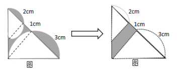 一個不規(guī)則的部分,分別連接兩半圓與等腰三角形兩邊的交點(如圖),根據(jù)直徑對應的圓周角是90°,可得兩虛線垂直于斜邊且相互平行,又因為大三角形是等腰三角形,則兩個小三角形也是等腰三角形,所以外部兩個弧形陰影的面積與內部兩個弧形的面積相等,故將外部大小兩弧形陰影分別向左、右旋轉90°(如圖8),陰影部分面積就轉化成了梯形的面積,所以梯形面積為