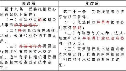 ?對受委托組織應(yīng)符合的條件作了修改:刪去了“事業(yè)組織”;受委托組織的工作人員也應(yīng)取得行政執(zhí)法資格。