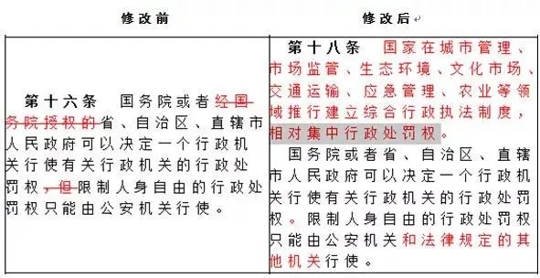 ?明確了相對集中行使行政處罰權(quán)的領(lǐng)域,在行政處罰法中確認了多年來綜合執(zhí)法制度改革的成果;決定行政機關(guān)行使行政處罰權(quán)的機構(gòu)刪除了“經(jīng)國務(wù)院授權(quán)的”;增加了限制人身自由的行政處罰權(quán)的行使機關(guān)——法律規(guī)定的其他機關(guān)。