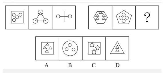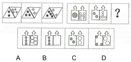 第二組圖形中的黑圓數(shù)量分別為1、2,那么問號(hào)處的第三個(gè)圖形,應(yīng)該是有3個(gè)黑圓,排除C選項(xiàng);第一個(gè)圖形的白圓數(shù)量等于后兩個(gè)圖形中白圓數(shù)量之和,由此應(yīng)選擇含有3個(gè)黑圓、2個(gè)白圓的圖形,所以這道題選擇D選項(xiàng)。