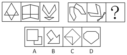 答案:D【解析】觀察圖形發(fā)現(xiàn),每幅圖都由兩個(gè)圖形組成,且分開看兩圖形均為軸對(duì)稱圖形。如下圖所示,將所有圖形的對(duì)稱軸分別畫出來后會(huì)發(fā)現(xiàn),第一組圖的對(duì)稱軸分別是平行(形成夾角為0°)、相交形成45°夾角、相交形成90°夾角;第二組圖也分別是平行(形成夾角為0°)、相交形成45°夾角,所以?處應(yīng)選擇一個(gè)兩圖對(duì)稱軸相交形成90°夾角的圖形,只有D項(xiàng)符合。故正確答案為D。