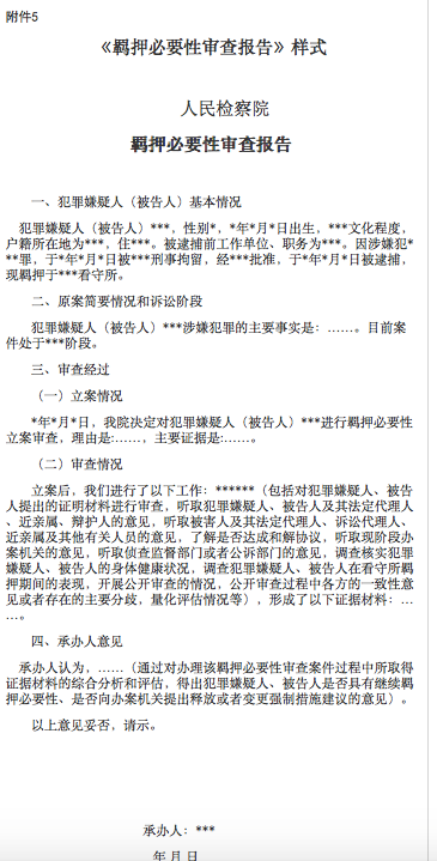 (3)最高人民檢察院《人民檢察院辦理羈押必要性審查案件規(guī)定(試行)》2016年1月13日最高人民檢察院頒布了《人民檢察院辦理羈押必要性審查案件規(guī)定(試行)》,為了加強和規(guī)范羈押必要性審查工作,維護被逮捕的犯罪嫌疑人、被告人合法權(quán)利具有重要作用。努力發(fā)揮非羈押措施的替代作用,擴大使用非羈押措施,保障人權(quán)。(4)最高人民檢察院刑事執(zhí)行檢察廳《關(guān)于貫徹執(zhí)行<人民檢察院辦理羈押必要性審查案件規(guī)定(試行)>的指導意見》該指導意見根據(jù)《人民檢察院辦理羈押必要性審查案件規(guī)定(試行)》指定。該指導意見進一步細化了審查標準、審查內(nèi)容,增加了評估犯罪嫌疑人、被告人有無繼續(xù)羈押必要性可以采取量化方式,設(shè)置加分項目、減分項目、否決項目等具體標準。